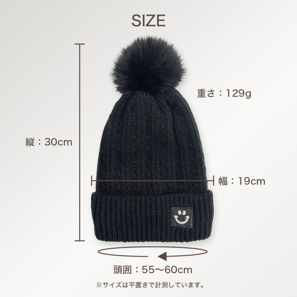 ● 高さ:30cm ● 幅:19cm ● 頭囲:55~60cm ● 重さ:129g